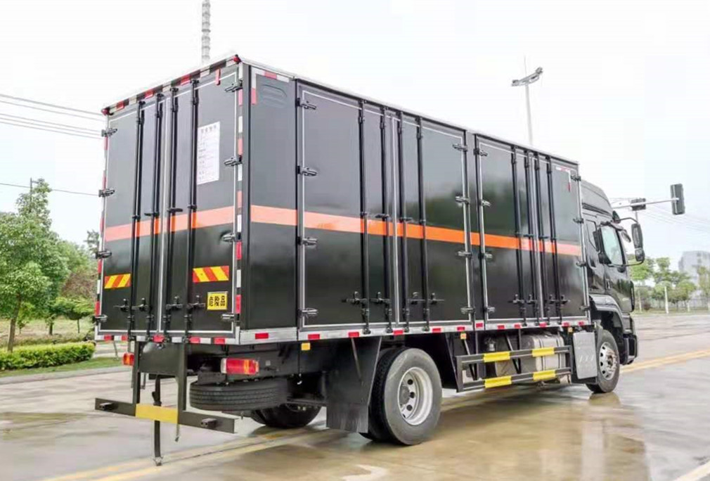 隨底盤選裝M3B駕駛室新面板,選裝導風板,選裝前面板亮條,選裝A柱貼膜,選裝保險杠、翼子板,選裝車門下飾板,選裝臥鋪側窗,選裝綠玻璃,選裝導流罩,選裝高頂駕駛室;該車為危險品運輸車,類型為EX/Ⅲ;廂體頂部密封,不可開啟,廂體兩側選裝不同形式側開門及開門位置或不帶側門,選裝瓦楞板結構.運送爆炸品的項號: 1.1 D,1.1 D,1.1B,1.1B,1.1G ,1.1C,1.3C,1.1 D,1.1 D,1.4G,1.1D,1.1 D,1.1B,1.1B,1.3C,1.1C,1.3C,1.1D 。側/后防護材料為Q235,連接方式:焊接連接,后防護截面尺寸(mm):120×60,離地高度410mm。選裝液壓尾板時,后防護截面尺寸(mm):600×130,離地高度410mm,液壓尾板收起狀態的水平長度為280mm,尾板重量為550kg;該車僅使用排氣管前置、前輪為盤式制動器、裝配子午線輪胎的底盤,轉向輪安裝輪胎爆胎應急防護裝置,后軸采用空氣懸架,安裝導靜電帶;該車裝有ABS,ABS型號/企業:ABS-E 4S/4M/威伯科汽車**系統(**)有限公司,CM4XL-4S/4M/廣州瑞立科密汽車電子股份有限公司;該車安裝具有衛星定位功能的行駛記錄儀,該車裝配有限速裝置,限速80km/h。采用發動機YCS06245-60A,油耗值為:25.8L/**km。選裝雙開門。